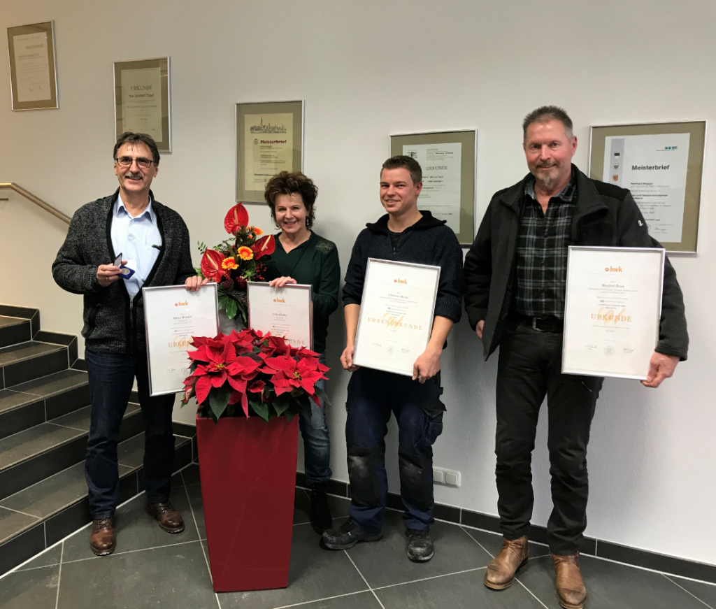 Auf unserem Bild zu sehen sind (v.l.) Hubert Boscher, Geschäftsführer, Meister des Zentralheizungs- und Lüftungsbau Handwerk, sowie Staatlich geprüfter Technischer Fachwirt. Herr Boscher wurde für 30-Jährige Betriebszugehörigkeit geehrt und die Urkunde mit Silbermedaille überreicht. Erika Hödtke, unserer langjährig kaufmännisch angestellten Mitarbeiterin an der Rezeption durften wir die Urkunde für 10-Jährige Betriebszugehörigkeit überreichen. Christian Dreier, Anlagenmechaniker für Sanitär-, Heizungs- und Lüftungsbau wurde ebenso für seine 10-Jährige Betriebszugehörigkeit geehrt. Wir sind sehr stolz unsere Auszubildenden so erfolgreich übernehmen zu können. Christian hat als Auszubildender am 01.09.2007 in unserem Unternehmen angefangen und seine Ausbildung absolviert. Nach etwa 4 Jahren als Monteur auf der Baustelle hat Christian noch die Prüfung zur „Elektrofachkraft für festgelegte Tätigkeiten im SHK-Handwerk“ abgelegt. 2015 konnten wir ihn dann zu unserem Kundendienst-Team dazugewinnen. Wir freuen uns, dass du bereits nach 10 Jahren einen solchen Werdegang zurückgelegt hast. Manfred Rauh, Manfred wurde für 40-Jährige Betriebszugehörigkeit geehrt. Ihm wurde die Urkunde mit Goldmedaille überreicht. Manfred hat am 01.09.1977 seine Ausbildung zum Anlagenmechaniker für Sanitär-, Heizungs- und Klimatechnik bei der Firma Fischer (damals noch unter der Leitung von Oskar Fischer) begonnen. Seither ist er der Firma treu geblieben. Er gehört zu unseren leitenden Mitarbeitern und wird durch seine langjährige Erfahrung sehr geschätzt.